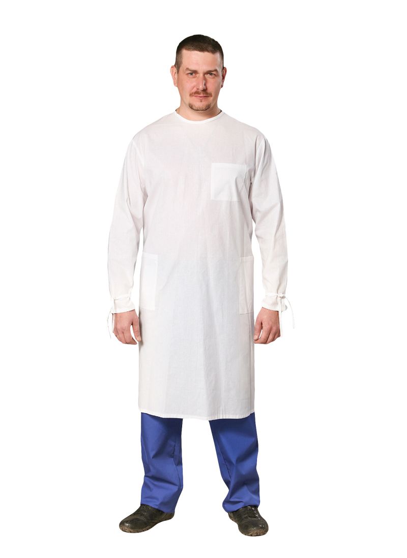 Длина халата ниже колена, рукава длинные, карманы накладные, завязки сзади.