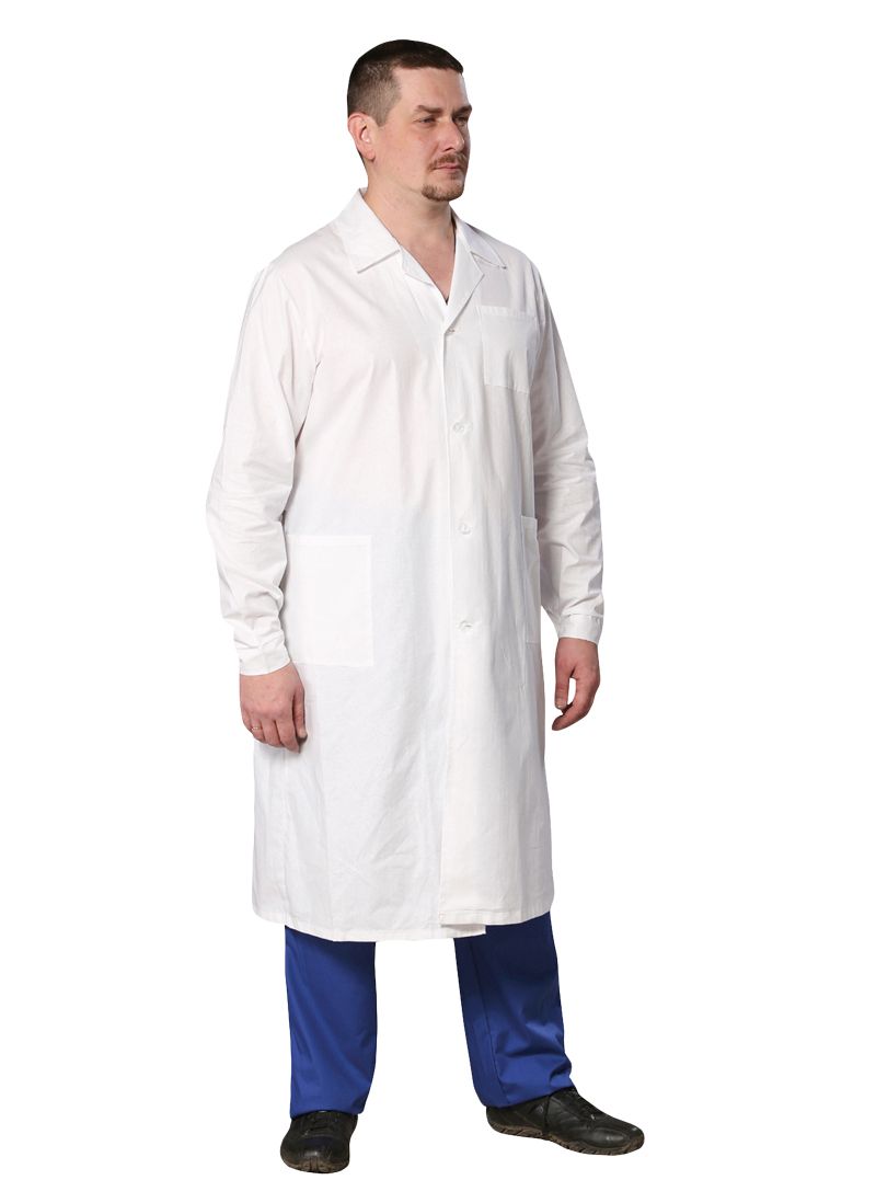 Халат с центральной бортовой застежкой на пуговицы. На женском халате предусмотрены нагрудные вытачки на полочках. Один нагрудным и два нижних накладных кармана.