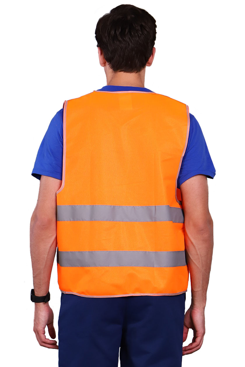 Жилет прямого силуэта, центральная застежка на липучку. Две полосы СОП 50 мм расположены на передних полочках и спинке в два ряда.